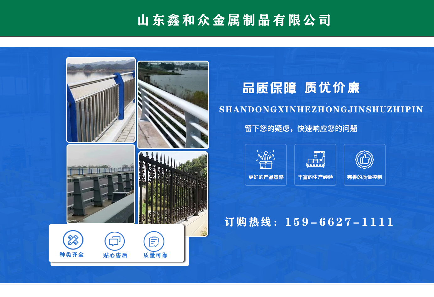 山東鑫和眾金屬制品有限公司主要產(chǎn)品有防撞護(hù)欄,橋梁護(hù)欄,道路護(hù)欄,河道護(hù)欄,不銹鋼護(hù)欄等護(hù)欄。提供設(shè)計(jì)方案,一站式定制,包您滿意價(jià)格優(yōu)惠,歡迎來電咨詢! 公司常年從事銷售護(hù)欄防撞護(hù)欄,橋梁護(hù)欄,道路護(hù)欄,河道護(hù)欄,不銹鋼護(hù)欄,橋梁鋼護(hù)欄,河道燈光護(hù)欄等。產(chǎn)品廣泛應(yīng)用于橋梁、河道、旅游景區(qū)、道路、公路、公園、小區(qū)、景觀、道路防撞等領(lǐng)域?! 」井a(chǎn)品均采用優(yōu)質(zhì)不銹鋼材料,符合相關(guān)標(biāo)準(zhǔn)。各種型號不銹鋼復(fù)合管及護(hù)欄,質(zhì)量嚴(yán)格把控。產(chǎn)品強(qiáng)度高、耐腐蝕、焊接牢固、抗沖擊、性能好,防撞護(hù)欄結(jié)構(gòu)簡單、美觀實(shí)用大方?! g迎前來訂購!...